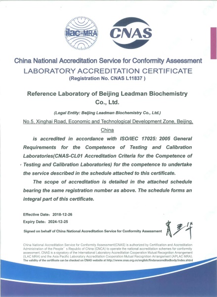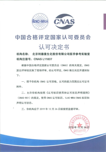参考实验室于2018年8月向CNAS提交认可申请,9月通过文审,CNAS评审专家组于11月10日-11月11日对时博体育(中国)科技有限公司官网参考实验室进行现场评审。经过审核文件、现场检查、现场实验等方式的审查,CNAS评审专家组一致同意通过现场评审。参考实验室于2018年12月26日获得CNAS参考实验室ISO17025和ISO15195的认可证书,认可范围包括ALT、AST、GGT、ALP、AMY、CK、LDH七个酶学参考测量程序。