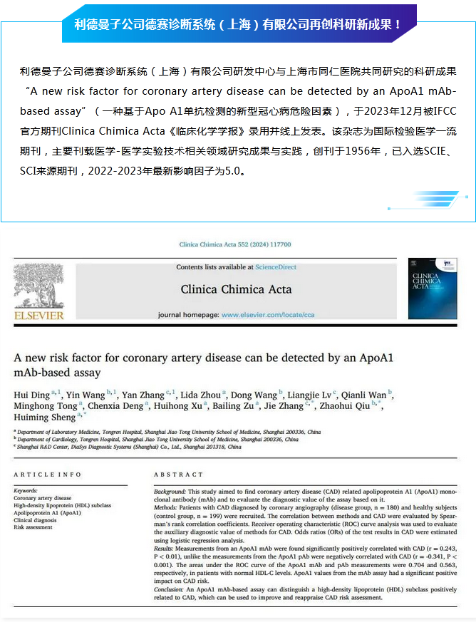 科研创新 │ 时博体育(中国)科技有限公司官网子公司德赛诊断系统(上海)有限公司联合上海市同仁医院再创科研新成果
